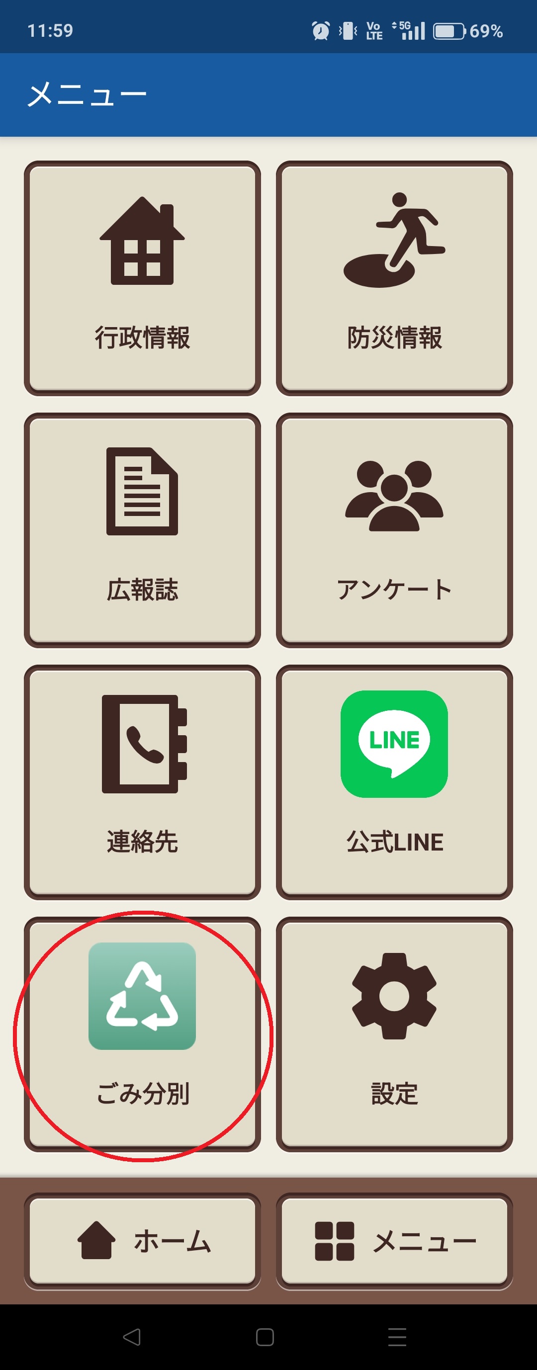 「ライフビジョン」をインストール済みの方は、画面右下の「メニュー」下部にある「ごみ分別」ボタンよりインストールしてください。 ※「ライフビジョン」をまだインストールしていない方はこちらから