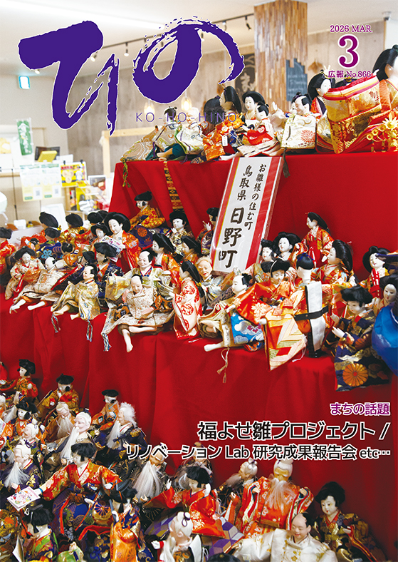 1ページ 表紙 2~3ページ 近藤新町長あいさつ 4~5ページ まちの話題、健康情報コーナー、集落支援員だより 6~7ページ 狂犬病予防注射、日野病院 8~9ページ 人権のまちひの 10~11ページ 日野高ニュース、文化センターだより 12~13ページ 下榎交流センターだより、歴史の窓、消費生活相談 14~15ページ 教育委員会、くらしのカレンダー 16ページ おすすめレシピ、福よせ雛、おしどりニュース