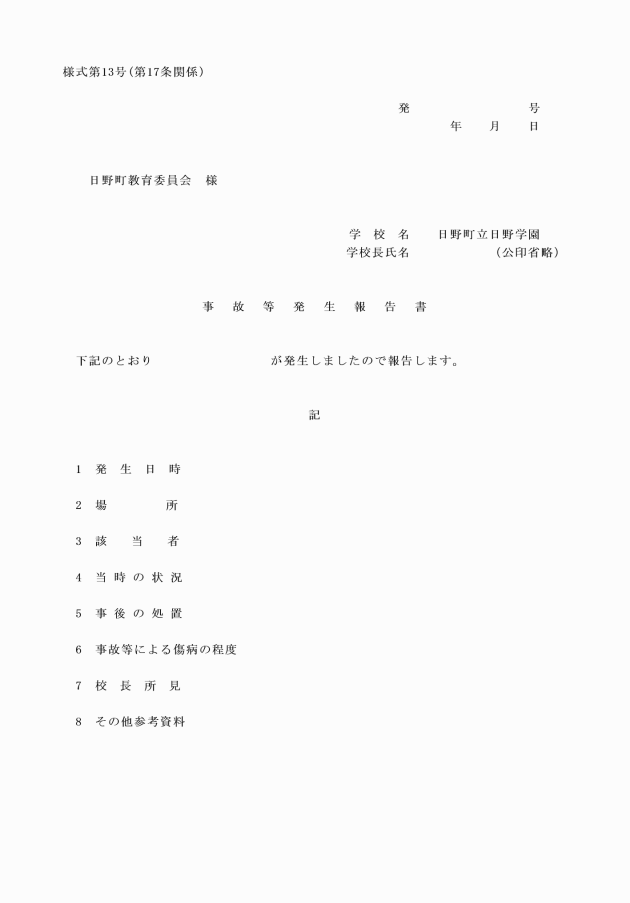 第17条 次に掲げる事故が発生した場合は、校長は、速やかに教育委員会にその事情を連絡し、なお、後日詳細に報告しなければならない。