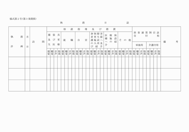 第3条 社会福祉主事その他身体障害者の更生援護の措置に関する業務に従事する者は、当該業務について、執務日誌(様式第2号)に必要な事項を記載するものとする。