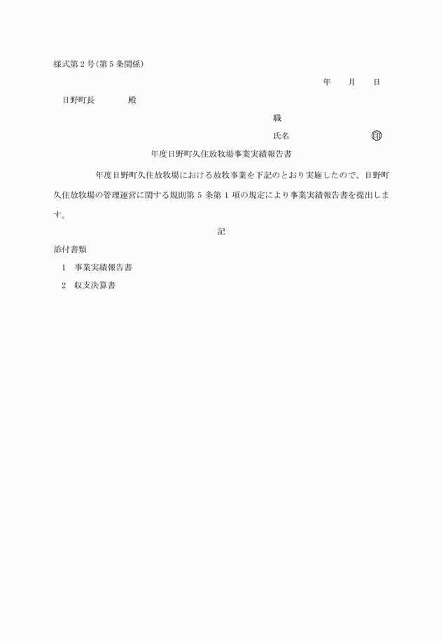 第5条 組合長は、毎年度、当該年度末までに放牧事業にかかる日野町久住放牧場事業実績報告書(様式第2号)を町長に提出しなければならない。