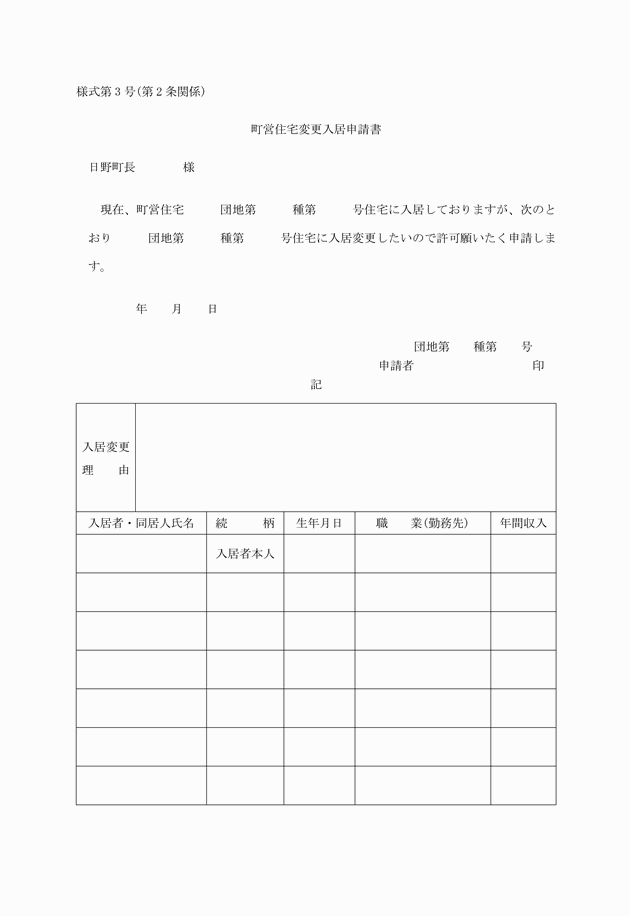 第12条 入居者は、出生、死亡又は転出により同居者の人員について異動があったときは、当該異動の日から10日以内に町営住宅同居者異動届(様式第20号)を町長に提出しなければならない。