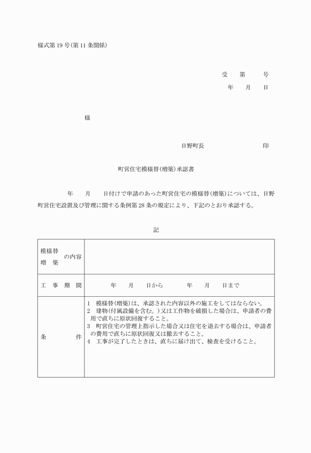 3 町長は、条例第28条第1項ただし書の規定により模様替又は増築を承認したときは、町営住宅模様替(増築)承認書(様式第19号)を申請者に交付するものとする。