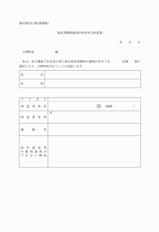 第3条 町長は、要支援者のために後見・保佐・補助のいずれの類型で審判の請求をすべきかを要支援者の判断能力の程度等により判断し、審判開始申立書及び申立付票を作成する。