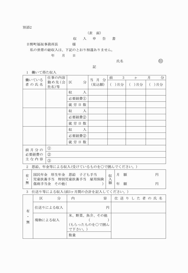 2 前項の書面には、省令第2条第2項に定めるもののほか、次に掲げる書類のうち、福祉事務所長が必要と認めるものを添付するものとする。