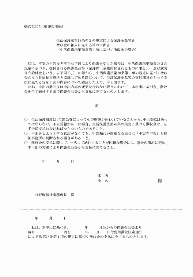 2 法第78条の2第1項又は第2項の規定により保護費又は就労自立給付金から法第78条第1項に基づく徴収金の支払に充てる旨の申出は、申出書(法第78条第1項関係)(様式第35号)によるものとする。