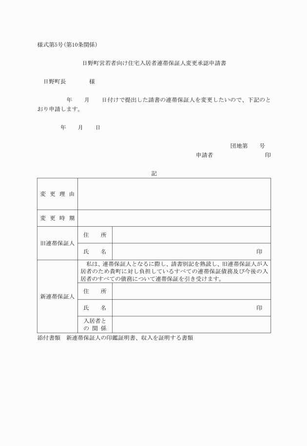4 入居者は、連帯保証人を変更しようとする場合又は次の号のいずれかに該当することとなった場合は、直ちに日野町営若者向け住宅入居者連帯保証人変更承認申請書(様式第5号)を町長に提出し、その承認を受け、条例第11条第1項第1号に規定する請書を提出しなければならない。
