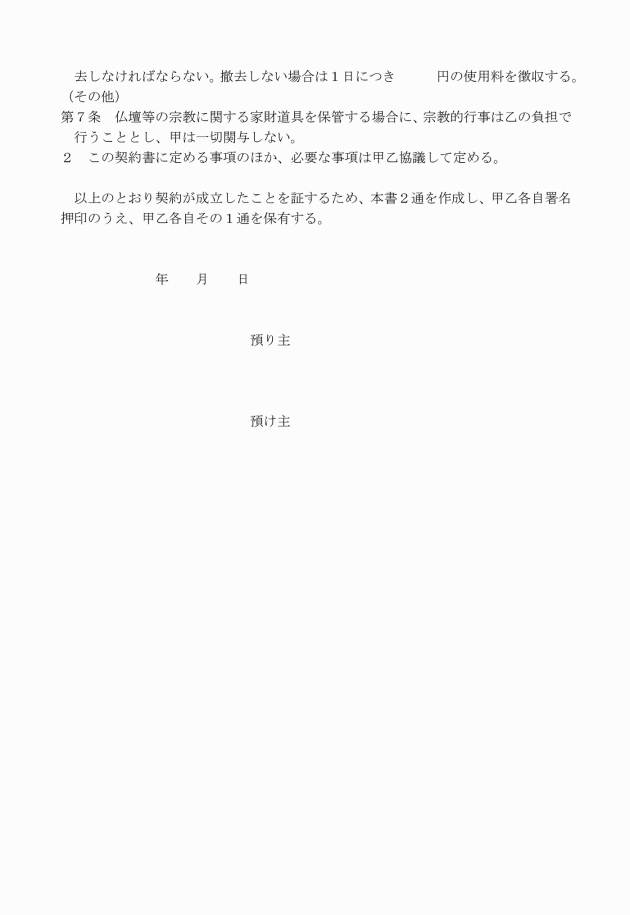 3 対象者は契約満了日又は前項の通知により定められた日までに預けた家財道具を撤去しなければならない。撤去しなかった場合に必要となる処分料については対象者が負担するものとする。