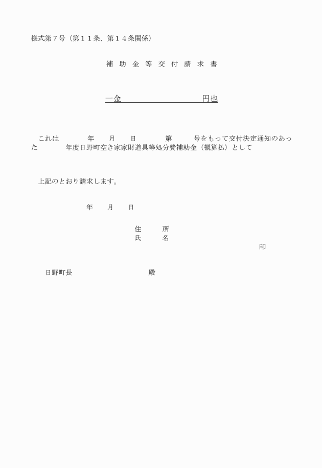 第1条 この要綱は、日野町空き家家財道具等処分費補助金(以下「本補助金」という。)の交付について、日野町補助金等交付規則(昭和45年日野町規則第20号。以下「規則」という。)に定めるもののほか、必要な事項を定めるものとする。