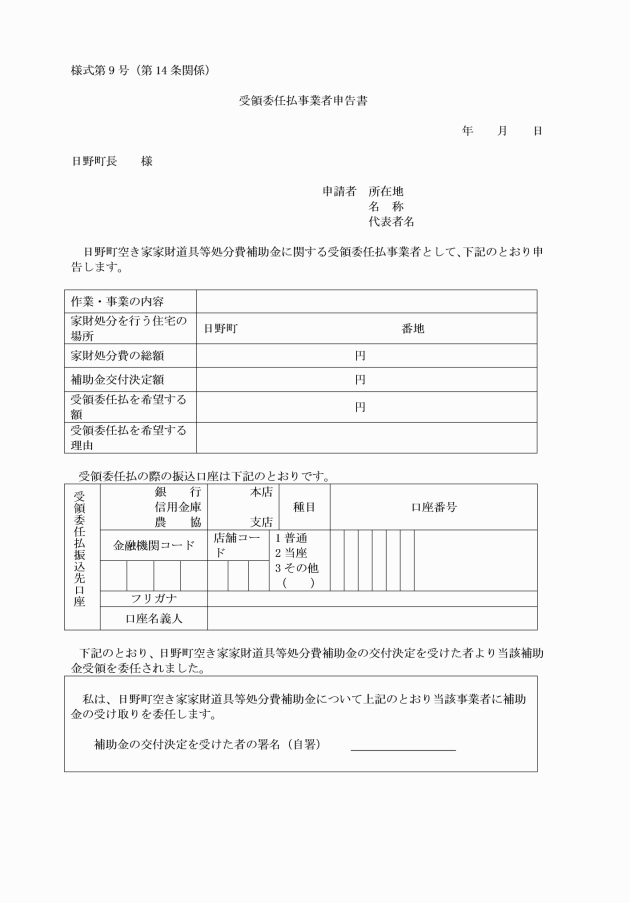 第11条 交付決定者から補助対象事業の依頼を受けた事業者(以下「事業者」という。)は、家財の処分作業等がすべて完了し、代金の請求を行うとき交付決定者が希望する場合には、交付決定額の範囲内で受領委任払によって補助金の交付を受けることができるものとする(以下「受領委任払」という。)。