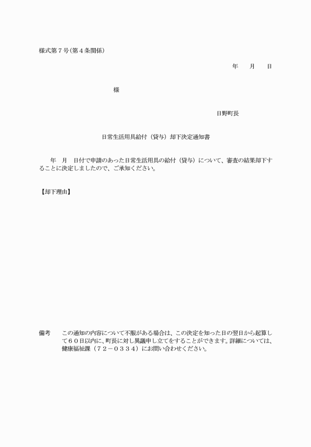 4 町長は、用具の給付等を行わないことを決定したときは、申請者に対し却下決定通知書(様式第7号)により通知するものとする。